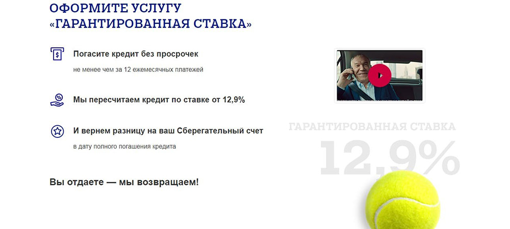Смысл услуги Гарантированная ставка сводится к тому, что, если заемщик внесет 12 платежей без просрочек, банк уменьшит ему ставку до 7,9% или 9,9% в зависимости от тарифа обслуживания. Ранее уплаченные взносы будут пересчитаны, а разница вернется на счет клиента.