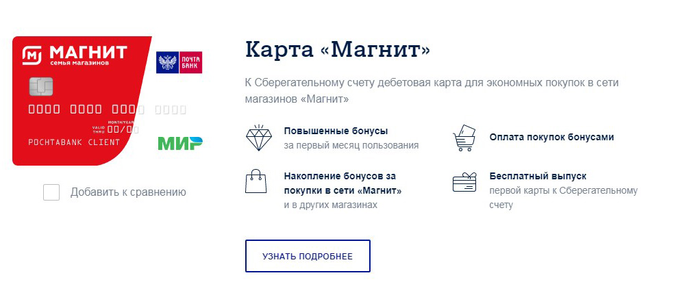 «Магнит» выбирают для экономной оплаты покупок в одноименной торговой сети. Эта бесконтактная карта платежной системы «Мир» совмещена со сберегательным счетом, что позволяет получать доход от остатка до 6% годовых. За оперативное информационное обеспечение с применением SMS-сообщений первые 8 недель платить не надо. Далее со счета списываются 49 руб./мес.