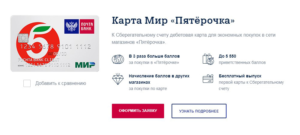 «Пятерочка» создана в рамках сотрудничества с одноименной торговой сетью. Баллы начисляются первые 6 месяцев за каждый оплаченный чек на сумму от 555 руб. Карта совмещена с открытием и обслуживанием сберегательного счета. Возврат до 20% предусмотрен партнерской программой платежной системы «Мир».