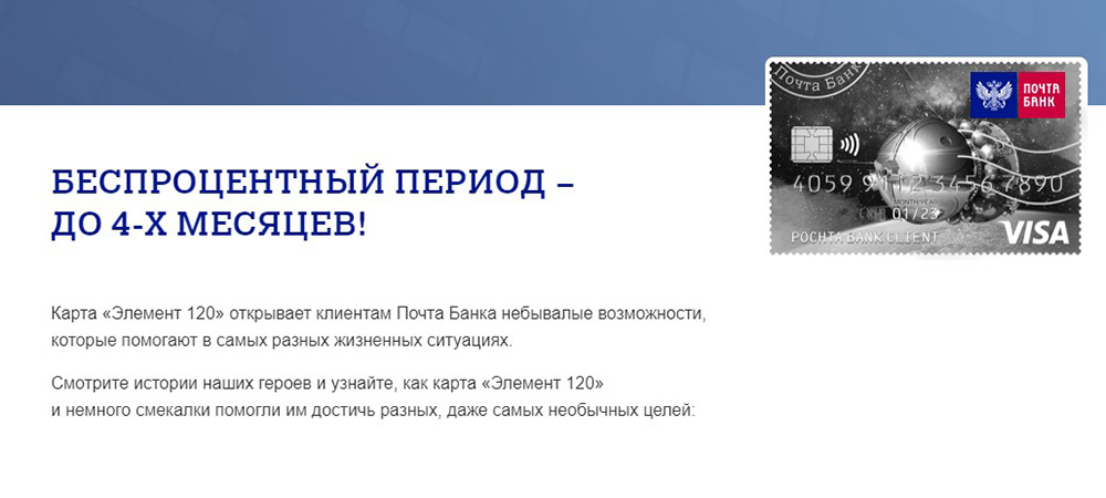 Самая простая из них — это кредитная карта. Банк предлагает несколько разновидностей этого платежного инструмента. Человеку, который хочет использовать его как замену рассрочки, подойдет программа «Элемент 120». Преимущества этого продукта: